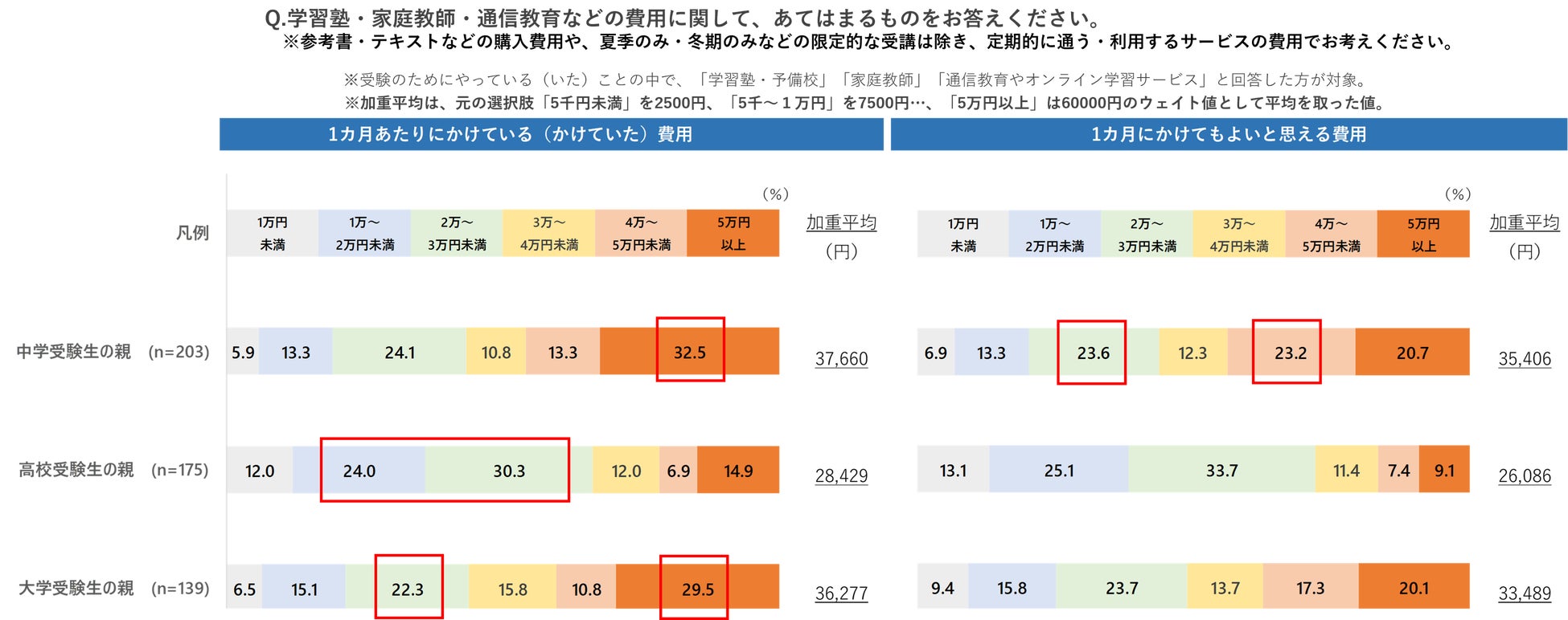 中学受験生では「5万円以上」が32.5%と最も多くなっています。一方、高校受験生は1万円台・2万円台がボリュームゾーンとなっています。大学受験生は「5万円以上」が29.5%と多い一方、2万円台にもボリュームゾーンがあり、人や家庭によって違いがありそうです。