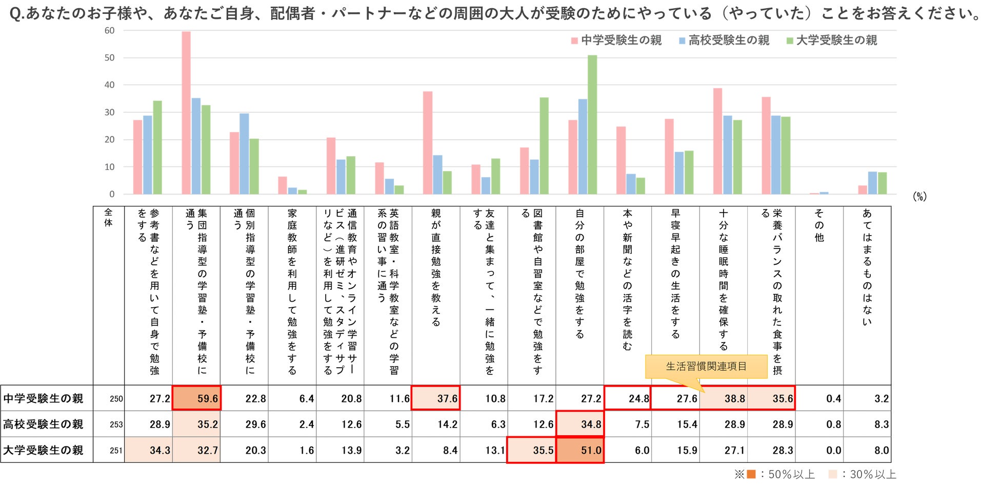 中学受験生では「集団指導型の学習塾・予備校」を筆頭に「親が直接勉強を教える」「本や新聞などの活字を読む」が高校・大学受験生より15pt※以上高く、「早寝早起き」「十分な睡眠時間確保」「栄養バランスの取れた食事」などの生活習慣関連項目も他より高めとなっています。