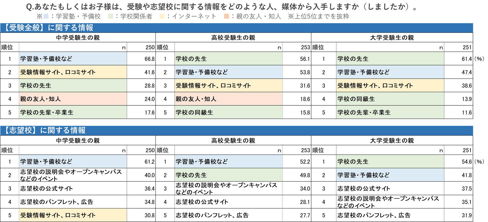 次に、【受験全般】、【志望校】の情報をどのような媒体から入手しているかを見ていきます。