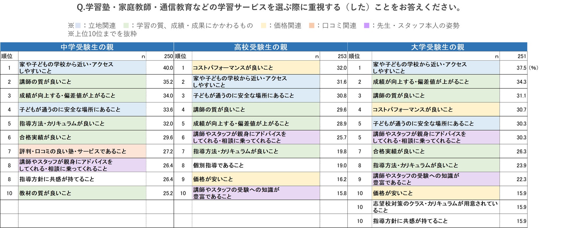 一方、高校・大学受験生では「コスパ」「価格が安い」が10位以内に入っているのに対し、中学受験生では価格関連が10位内に入らず、「評判・口コミ」が上位に入りました。中学受験に関しては、親もある程度費用がかかることは想定していて、価格の安さより「評判・口コミ」を重視するなど質の高い学習サービスを選びたいと考えているのかもしれません。