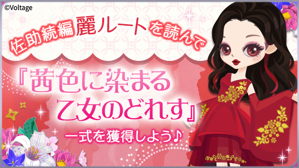 続編ストーリーのボイス実装に合わせて、アプリ内でキャンペーンを開催いたします。本キャンペーンでは、期間中に猿飛佐助の続編ストーリー・麗ルートを指定箇所まで期限内に読み終えると「茜色に染まる乙女のどれす」一式が手に入ります。この機会にぜひ、猿飛佐助の続編ストーリーを素敵なボイス付きでお楽しみください。