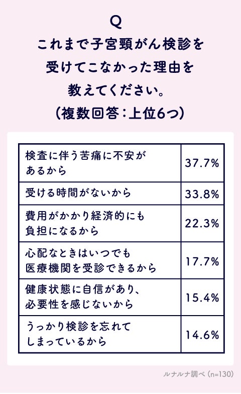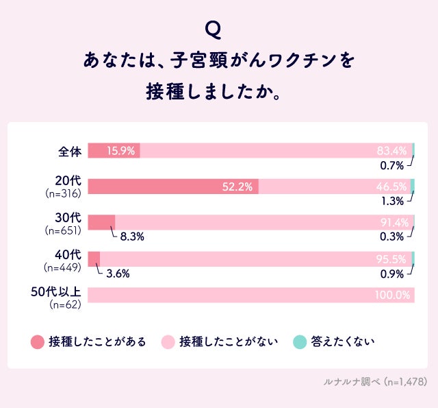 子宮頸がんのほとんどは「ヒトパピローマウイルス(以下、HPV)」が原因ということが分かっており、性的接触のある女性であれば50%以上が生涯で一度はHPVに感染するとされていますが、HPVワクチン接種により子宮頸がん全体の50から70%の原因とされる2種類のHPVの感染などを防ぐことができると言われています※2。以前、ルナルナで行った調査でもHPVワクチンの接種を考えていない理由として「接種後の副反応が心配だから」という回答が最も多い結果となりました※3。副反応を心配する声も根強いですが、ワクチン接種は自身の健康を守る手段のひとつでもあるため、メリットとリスクを医師や家族と相談しながら判断して欲しいと思います。