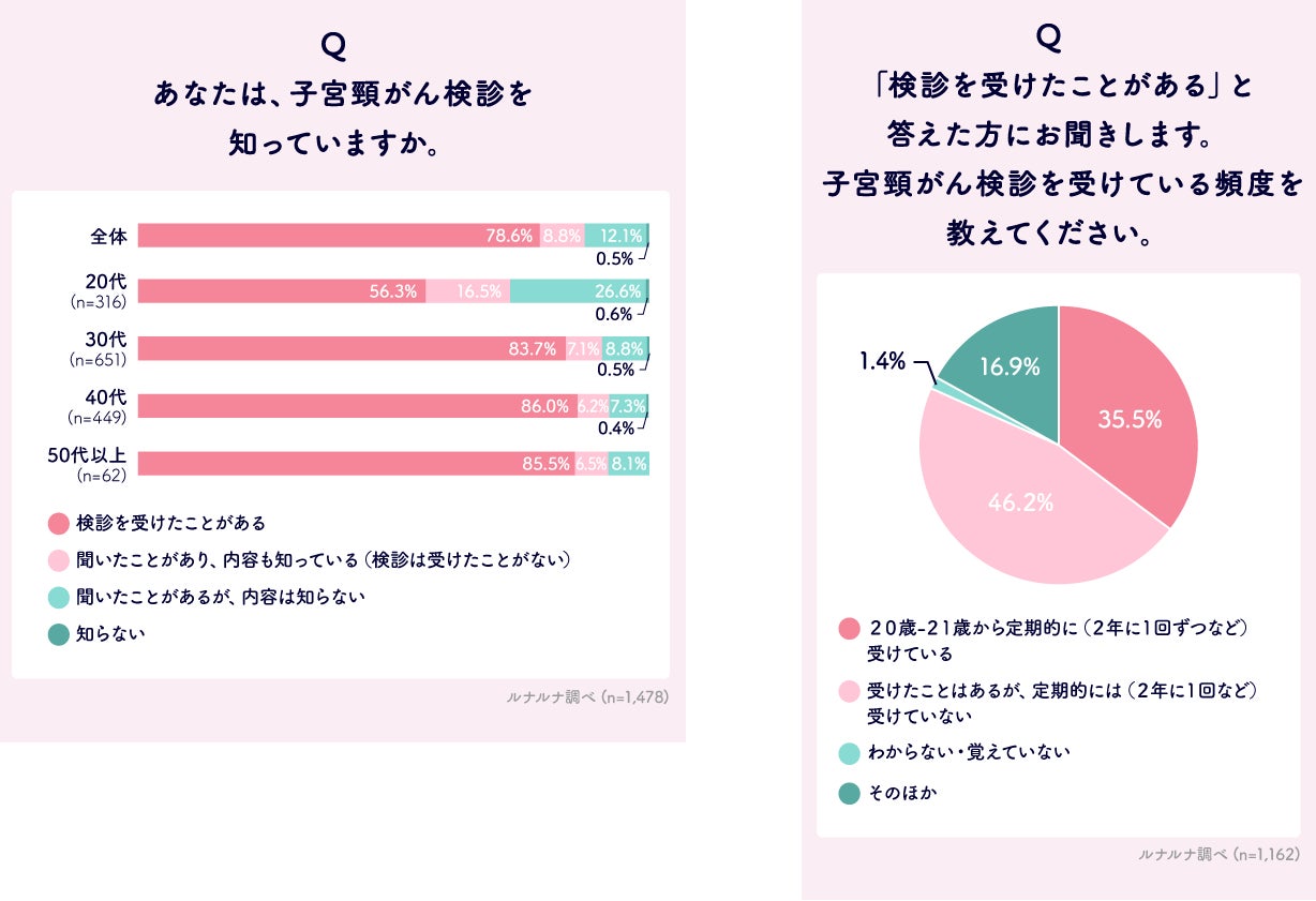 本調査では、子宮頸がん検診やヒトパピローマウイルスワクチン(以下、「HPVワクチン」)の接種率をはじめとするアンケートや、『ルナルナ』としては初めて、健康や医療に関する正しい情報を入手し正しく理解し活用する力である“ヘルスリテラシー”を計るとともに、“ヘルスリテラシー”の高低が医療知識に対してどのような影響をあたえているかを調べました。