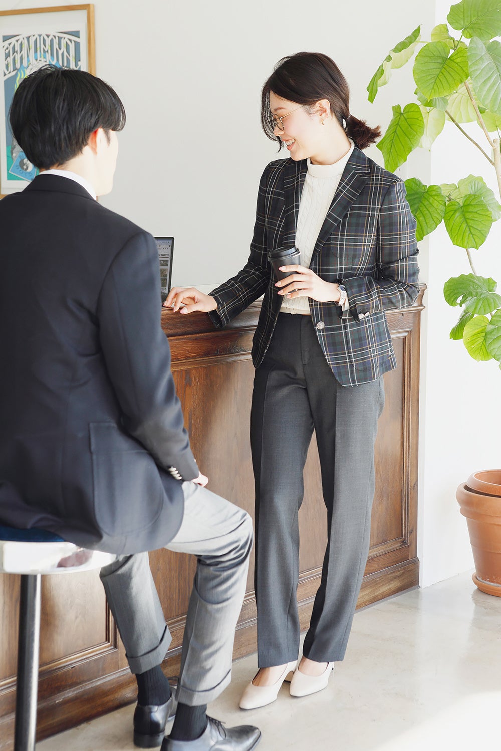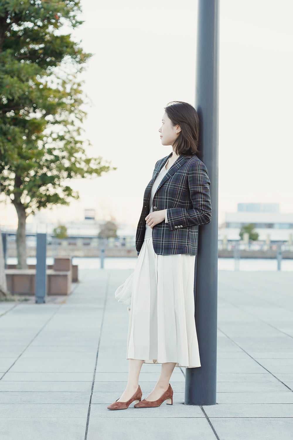 ブラックウォッチベースの奥行きのあるチェック柄ブレザーは、ビジネスシーンにもマッチ。身体に程よく寄り添う立体的なシルエットが、知的な印象に導きます。センタープレスの入ったグレーのパンツは、立ち姿が美しく足長効果も◎。インナーには、ホワイトのケーブルニットを合わせて好印象に。ベルトとパンプスも淡色でカラーを揃えて、爽やかさをUPさせて。