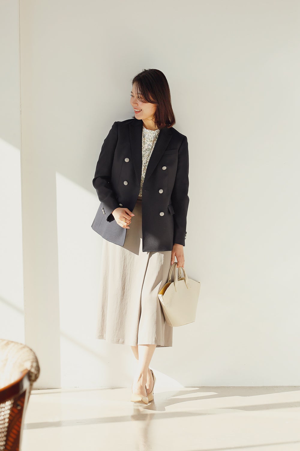 クールなイメージのダブルブレストをレディライクに楽しむなら、インナーには花柄ブラウスをセレクト。イングリッシュガーデンをイメージさせるリバティプリントなら、春のムードにぴったりの大人かわいいブレザースタイルに。ブラウスをタックインしてメリハリをつけることで、スカーチョともバランス良くお召しいただけます。