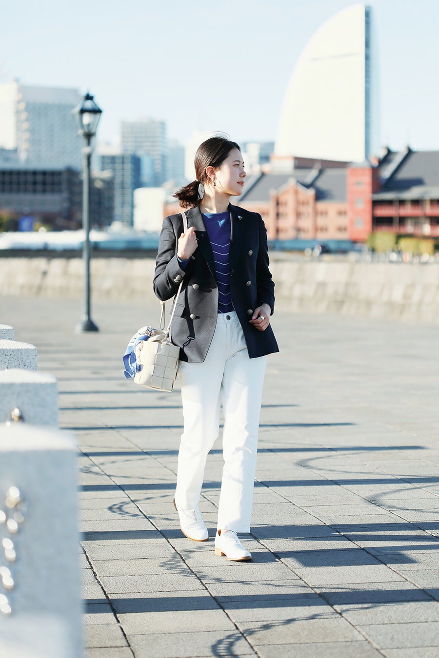 ブルーのボーダーニットを合わせた爽やかなマリンルック。ブレザー×ボーダーの定番合わせでも、ジグザグと波打つような細ラインのボーダーなら、いつものトラッドスタイルも鮮度アップ。船の碇をモチーフにいたオリジナルのメタル釦ともマッチ。バッグにつけたミニスカーフもヨット柄で、韻を踏んでいるところもさり気ないポイント。ラペルにも刺繍ブローチをつけて遊び心のあるコーディネートに。