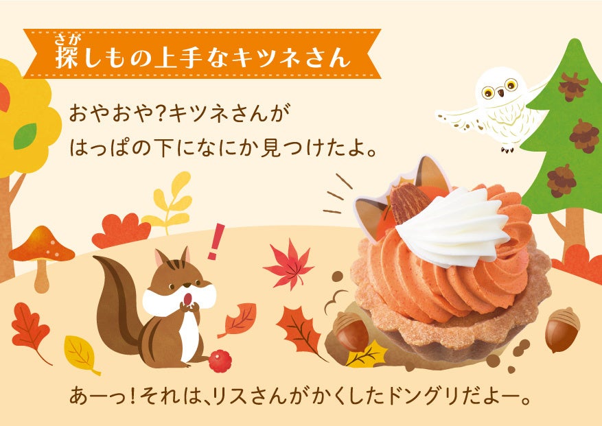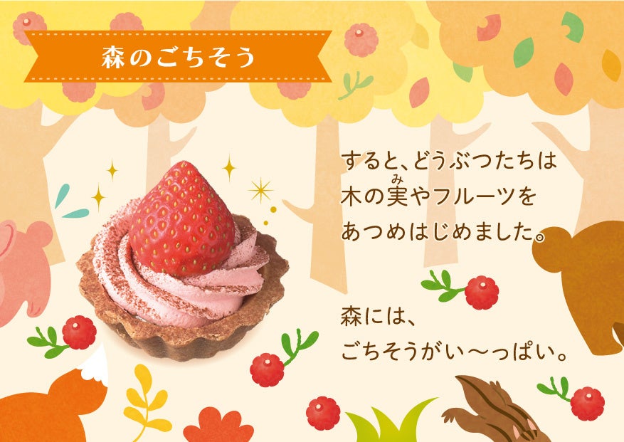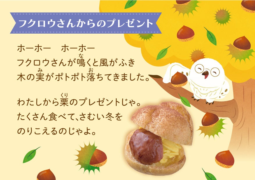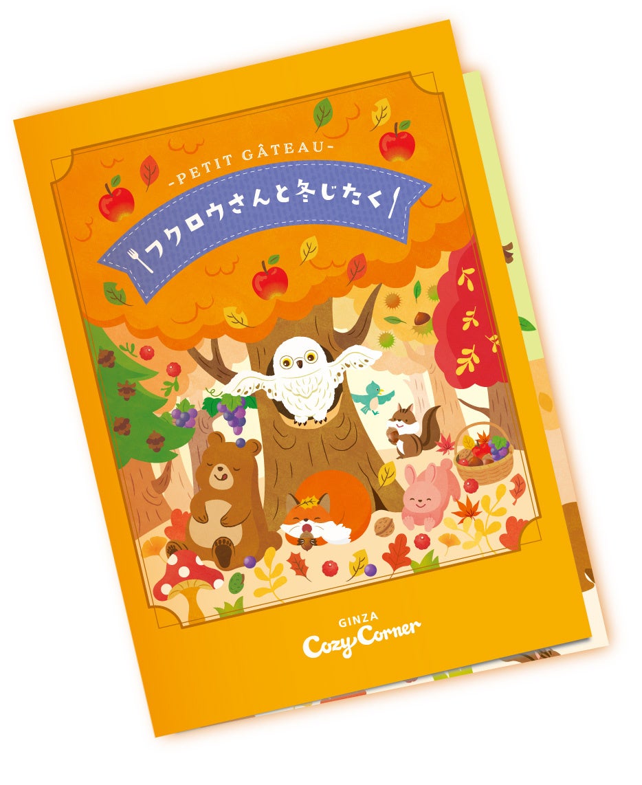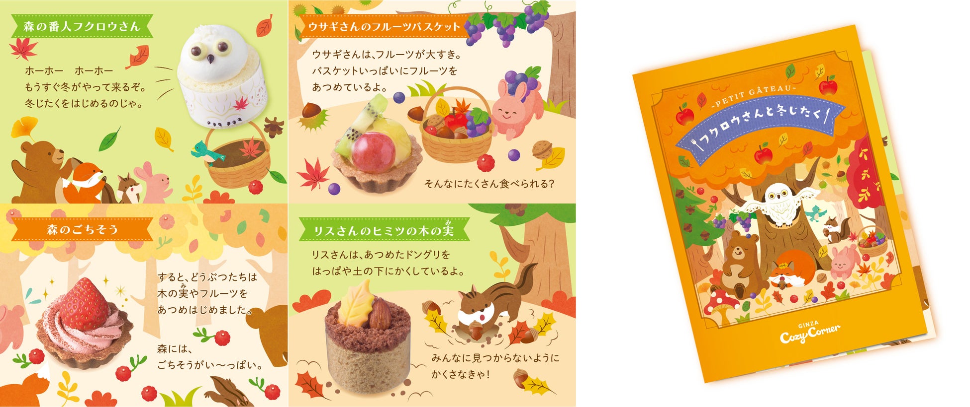「フクロウさんと冬じたく」の物語を1枚の絵本風リーフレットにしました。お話とプチケーキがページごとに載っており、みんなで物語を読みながらそれぞれのケーキをお楽しみいただけます。
