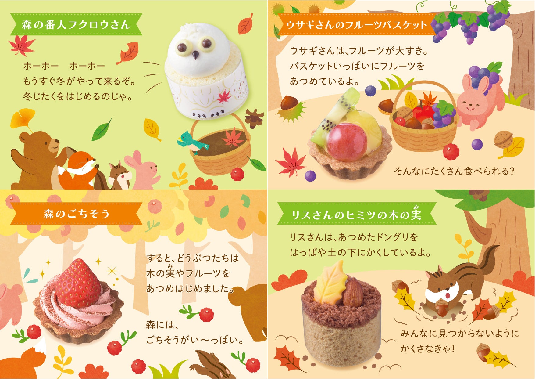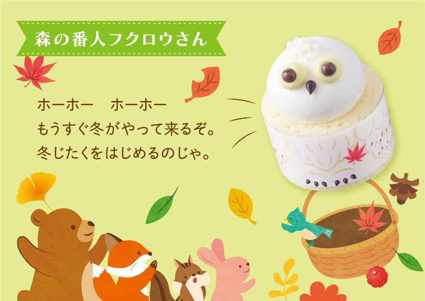 昨年は、リスさんが冬じたくする様子をプチケーキにした絵本風スイーツ。今年はフクロウさんが番人をしている森で、ウサギやクマなどの動物たちが冬じたくする様子をプチケーキにした「フクロウさんと冬じたく」ができました。