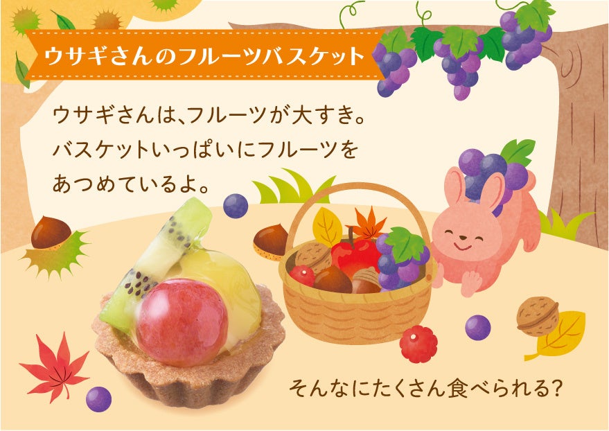 ウサギさんは、フルーツが大すき。バスケットいっぱいにフルーツをあつめているよ。そんなにたくさん食べられる?