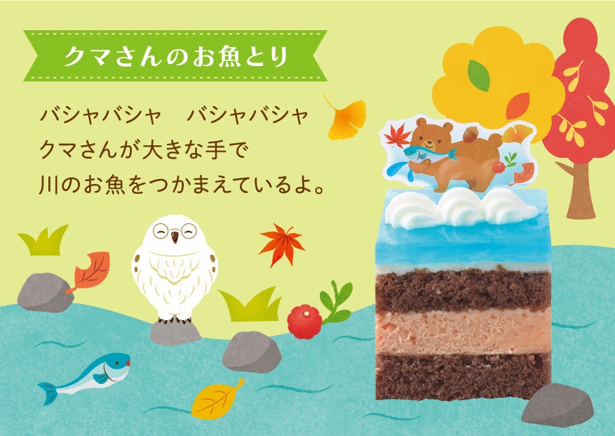 1つ1つのケーキにはストーリーがあり、例えば、ウサギさんが集めたフルーツはブドウや黄栗などを使ったタルトで、クマさんのお魚とりはソーダ風味のジュレを川に見立てたケーキで表現。旬のフルーツを取り入れることにもこだわりました。