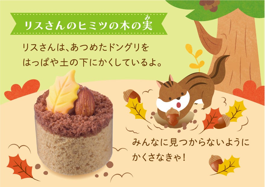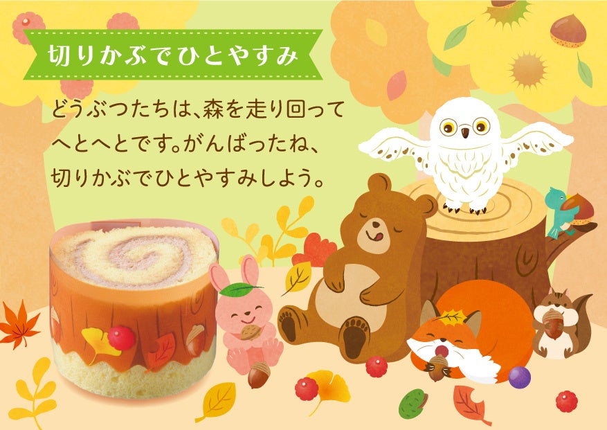 冬に向かってだんだんと寒くなる季節に、栗やブドウ、リンゴなど、おいしい旬の味覚をストーリー仕立てのケーキでお楽しみいただけたらと思い開発しました。フクロウさんと森の仲間たちが、みんなで冬を迎える準備をする様子を表現。お子様との会話のきっかけにスイーツを通しておいしく、楽しく、‟季節”を感じていただけたら幸いです。
