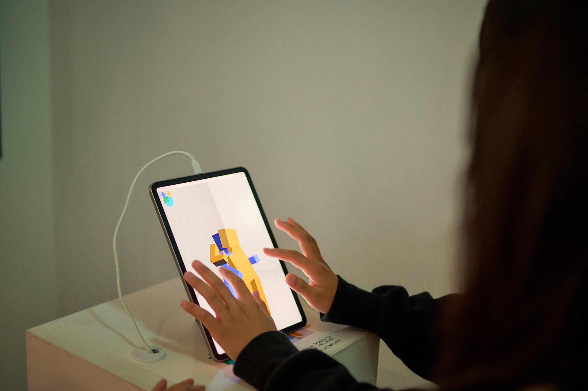 当日は、本展のプロジェクト・マネージャーである田篭美保さん(森美術館シニア・コーディネーター)の分かりやすい解説を聞きながら会場を回り、最初は緊張していた子供たちも田篭さんの何気ない問いかけに、おのおの感じたこと、疑問に思ったことを答えるうちに徐々に打ち解け、実際に展示されているインディー・ゲームの一つ、《ハグゲーム》を操作したりなど、国内外のアートに触れ合いました。