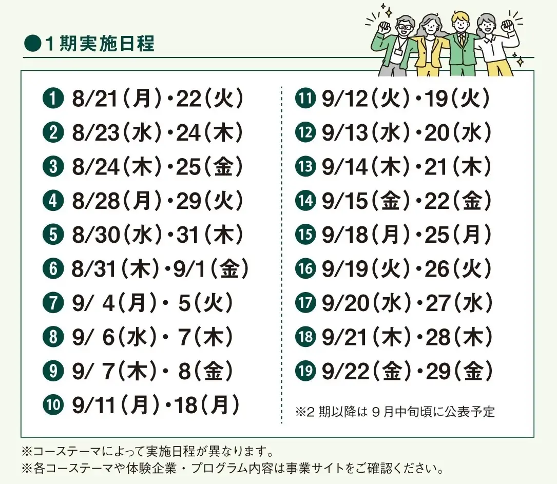 下記の4つのテーマに沿ったコースの中から参加を希望するコースを選択することで、2日間で2社(1社あたり3時間程度)のジョブトライアルに参加いただけます。
