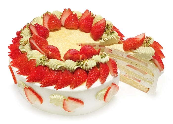 甘酸っぱいいちごを散りゆく桜の花びらに見立てて飾り、芽吹き始めた若葉をピスタチオクリームで表現しました。桜が新緑に移り変わる葉桜をイメージしたミルクレープです。