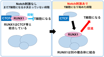 Notch刺激が入る前の細胞では、RUNX1は同じ転写因子の一つであるCTCFと結合し、T細胞になるために必要な遺伝子の働きを抑えていました。ところが、Notch刺激が入ると、RUNX1はCTCFから離れ、他のさまざまな全く異なる分子と結合して、T細胞に必要な遺伝子のスイッチを一斉にオンにすることが分かりました。このRUNX1の結合相手の切り替わりが、T細胞分化の開始を決定づける“最初のスイッチ”として機能していることを本研究は明らかにしました。