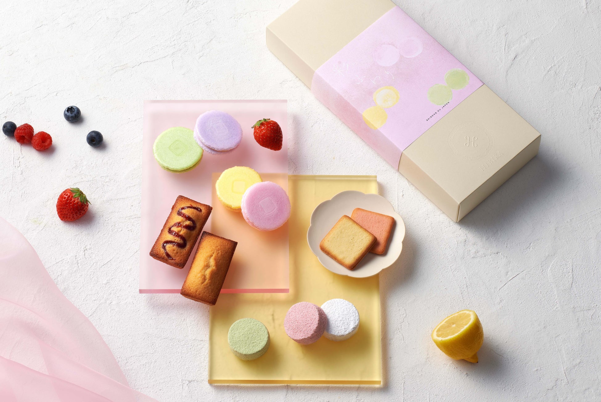 チューリップをモチーフにしたクッキー、いちごやはちみつ風味のサブレ、爽やかな酸味のレモンのメレンゲなど、春の味わいが広がる、HIBIKAらしいクッキー缶です。