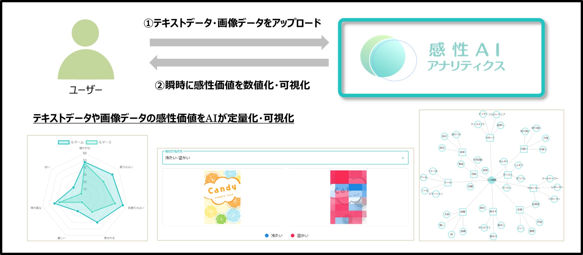 感性情報をAIにより定量化・可視化、分析することで、消費者の印象調査等の市場調査の回数を減らし、クリエイティブやキャッチコピーの選定までにかかるコストや期間を軽減・業務効率化推進に貢献します。