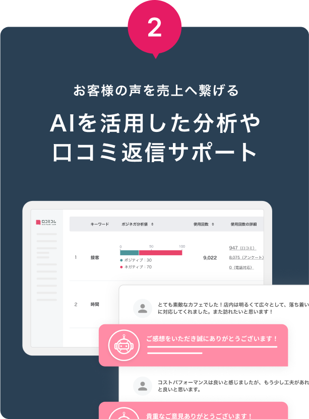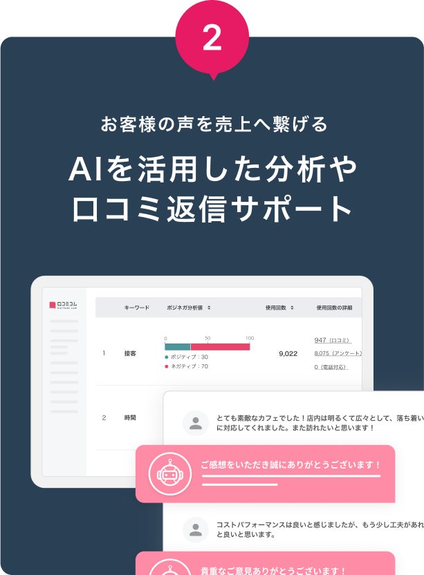 集約した口コミやアンケートをAIが解析・スコア化することで、分析の難しいお客様の声を様々な軸で定量的に分析し、経営判断や店舗改善に役立てることができます。また、口コミの返信もAIがサポートするので、お客様との円滑なコミュニケーションも実現します。