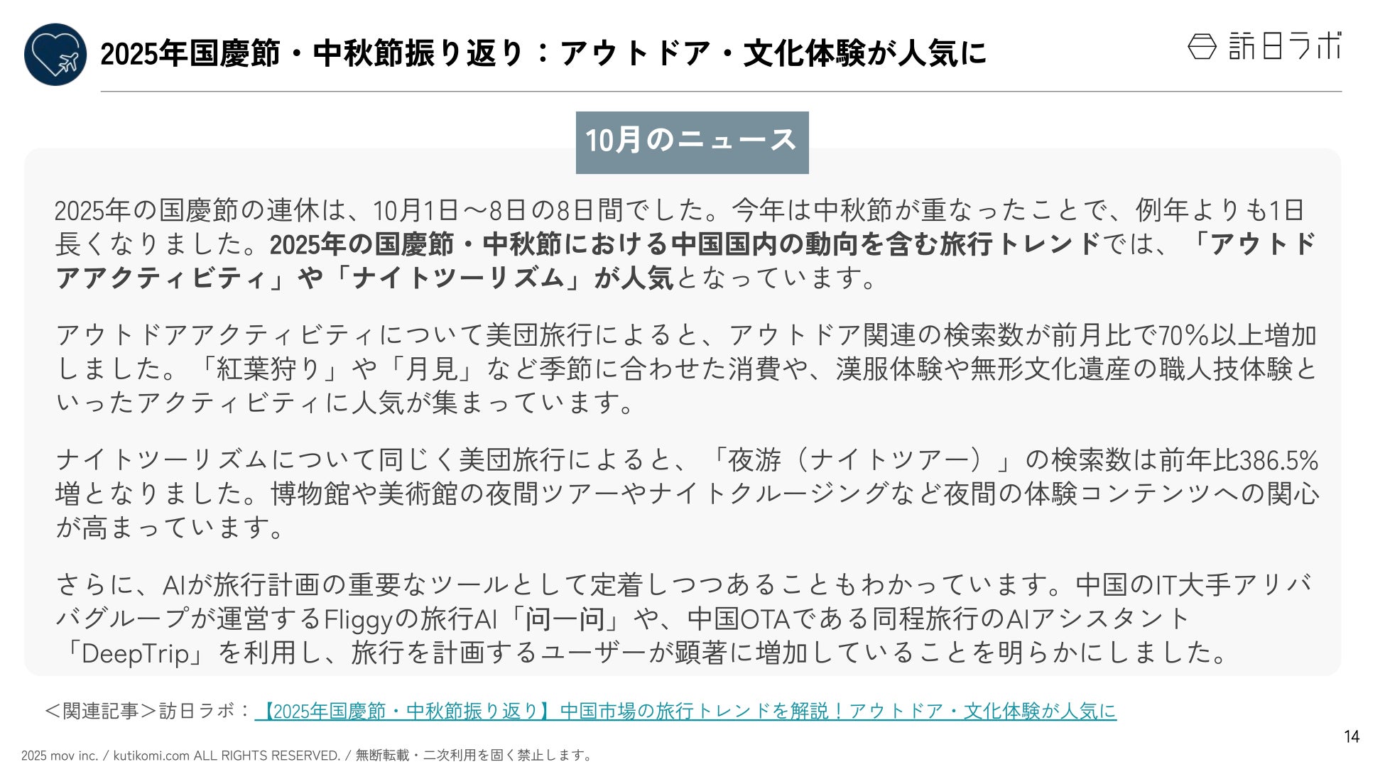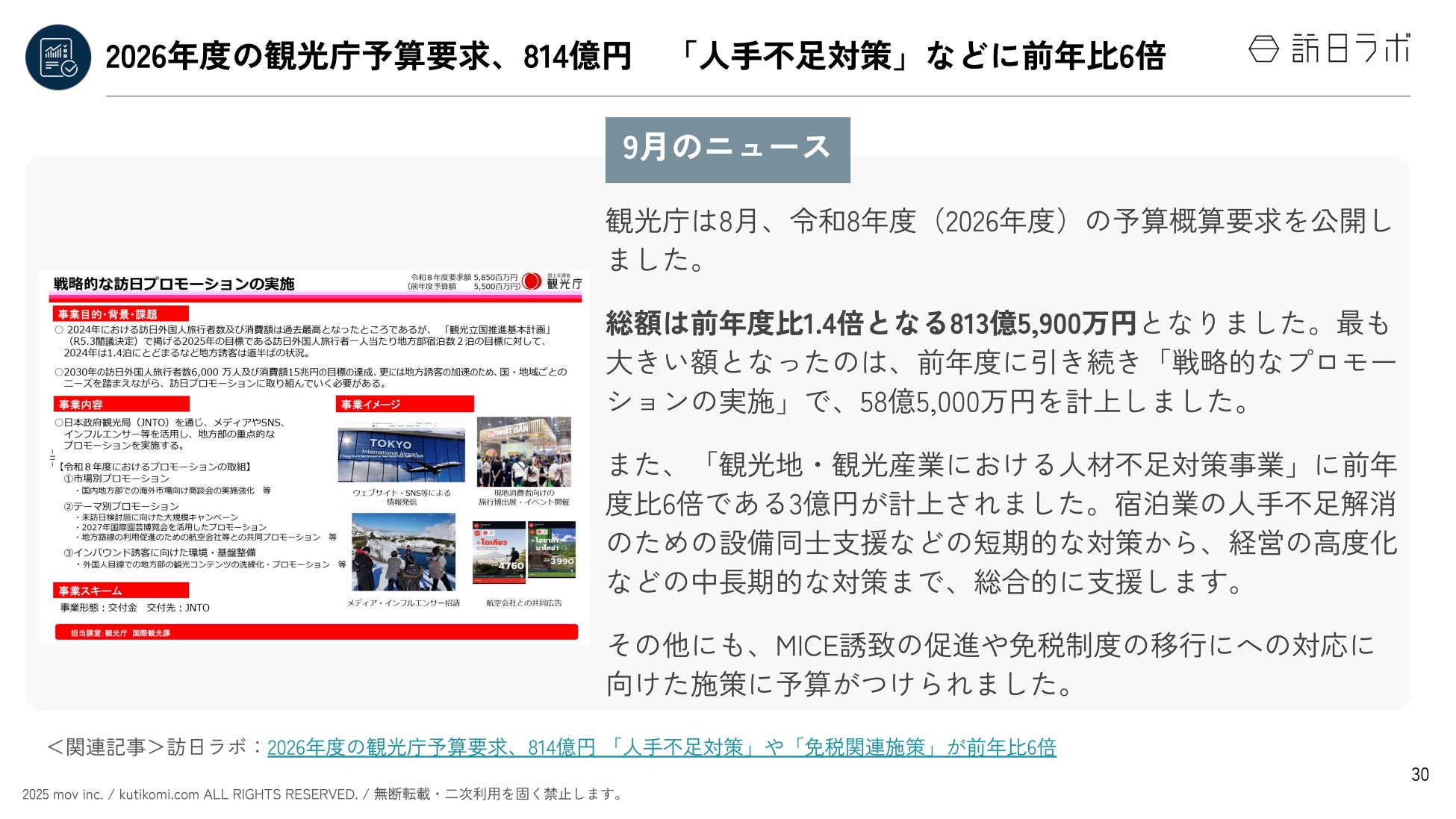 業界最大級のインバウンドビジネスメディア「訪日ラボ」及び 店舗向け集客一元化プラットフォーム「口コミコム」を運営する株式会社mov(代表取締役:渡邊 誠、本社:東京都渋谷区、以下mov)は、「インバウンド関連ニュースまとめ」「インバウンド関連サービスの動向」をはじめ、インバウンド対策に役立つニュースをまとめた「インバウンド情報まとめ【2025年下半期編】」を公開しました。