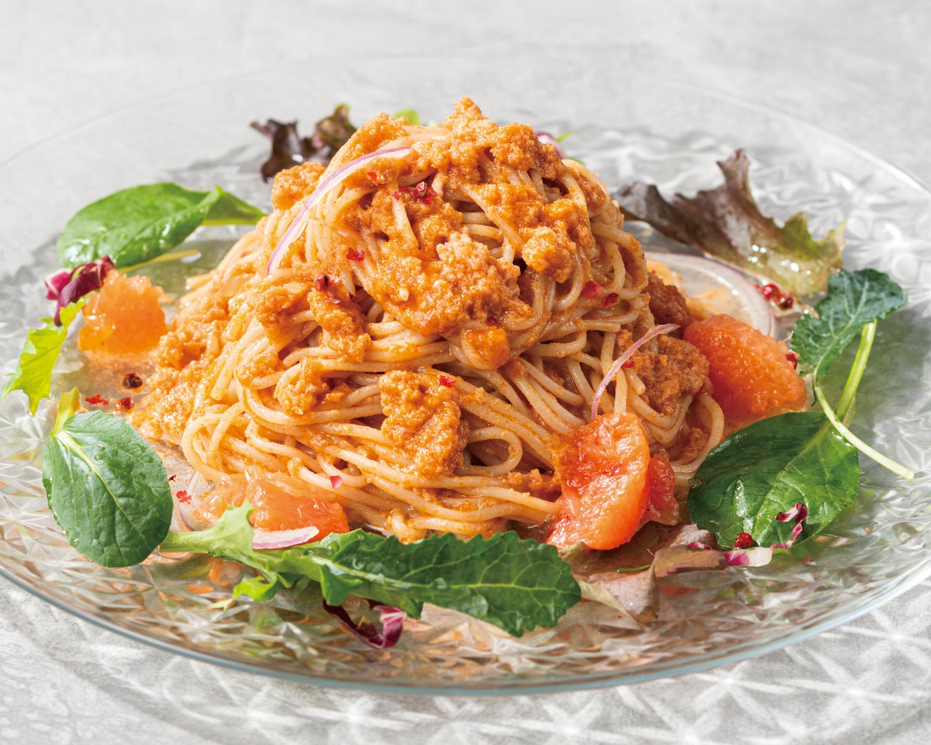 「オマール海老とルビーグレープの冷製スパゲッティ」は、オマール海老の身と濃厚な旨味がつまったソースを生パスタに合わせました。有機ベビーリーフとルビーグレープフルーツを添えたサラダ仕立てで、爽やかながらも食べ応えのある一皿に仕上げました。