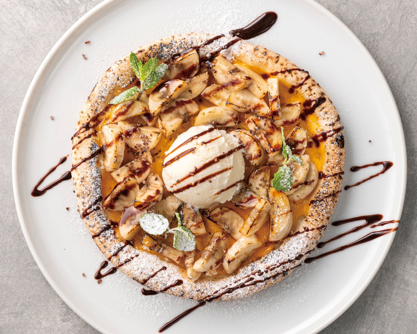 「焼きバナナとチョコのピッツァ」は、アングレーズソースを塗った生地にたっぷりのバナナをのせて焼き上げ、チョコレートソースとミルクジェラートを添えたデザート仕立てのピッツァです。高温のピザ窯で一気に焼きあげたピッツァは、気軽にご注文いただける18cmサイズでご用意しております。