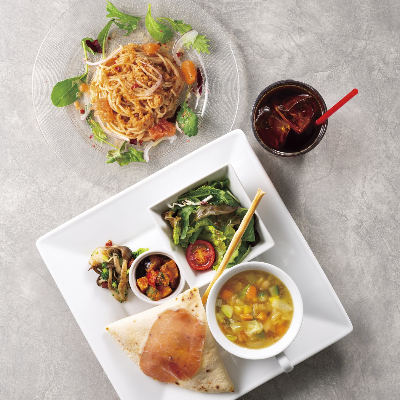 季節のピアットウニコなら、ワンプレートに盛り込んだ前菜5種とハーフサイズの「オマール海老とルビーグレープの冷製スパゲッティ」、ドリンクで一度にいろいろ食べたい気持ちが満たされます。