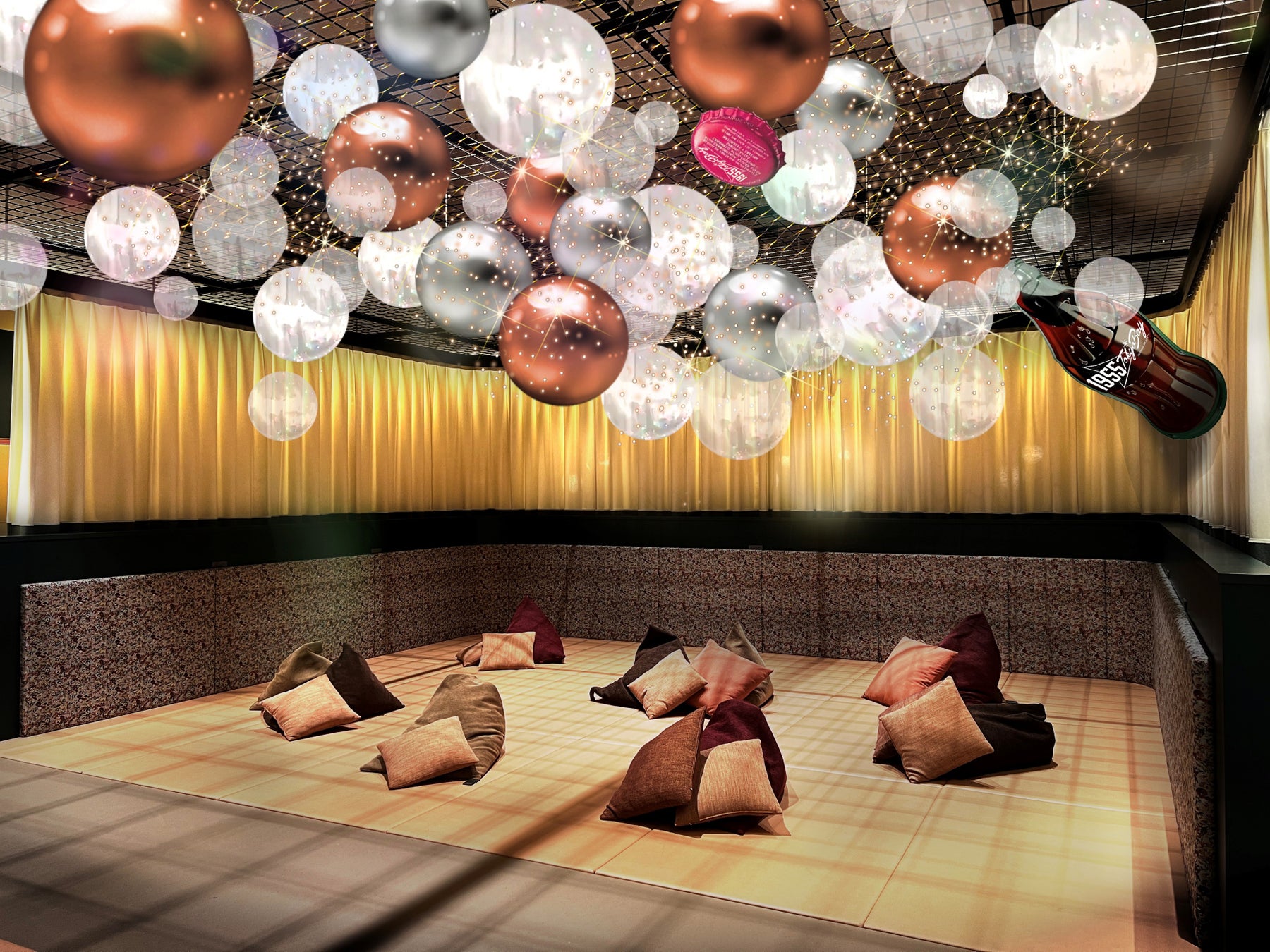 1955年頃のアメリカの世界観がモチーフの館内を、シュワッとはじける炭酸をイメージしたレトロアメリカンなクリスマスツリーと、きらめく泡をイメージしたスパークリングイルミネーションが彩ります。ロビーに登場する大きなクリスマスツリーは、炭酸の泡をイメージしたオーナメントのほか、アメリカの伝統的な飾りであるポップコーンとクランベリーのガーランドや、アメリカのロードサインを思わせる飾りで装飾され、レトロアメリカンなクリスマスを演出します。 きらめく炭酸の泡を表現したスパークリングイルミネーションが灯るのは、自由自在に過ごせるパブリックスペース「2nd Room」。靴を脱いで過ごせるエリアの天井に、まるでコーラの泡が立ち上がっているかのように丸いライトやオーナメントがキラキラと輝き、クリスマスムードを演出します。