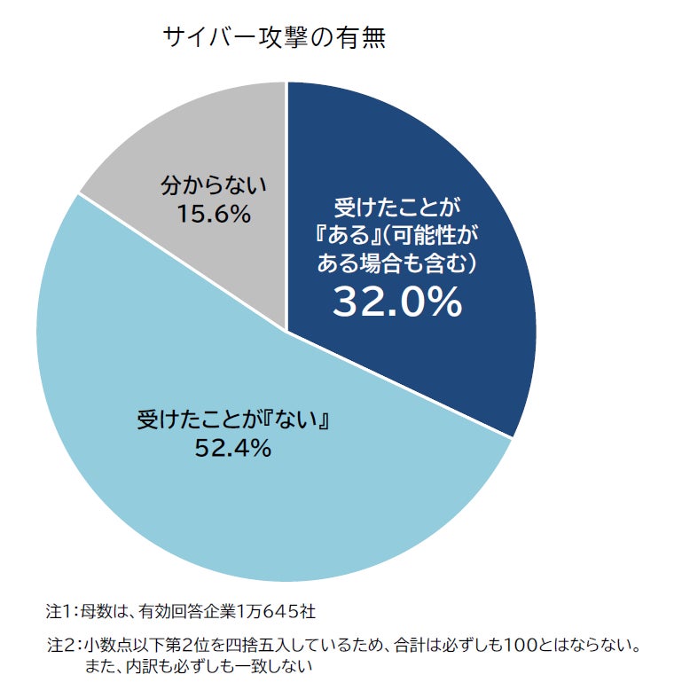 過去にサイバー攻撃を受けたことがあるか尋ねたところ、受けたことが『ある』(「1カ月以内に受けた(可能性がある場合も含む)」「3カ月以内に受けた(同)」「半年以内に受けた(同)」「1年以内に受けた(同)」「過去に受けたが、1年以内に受けていない」の合計)と回答した企業の割合は32.0%だった。