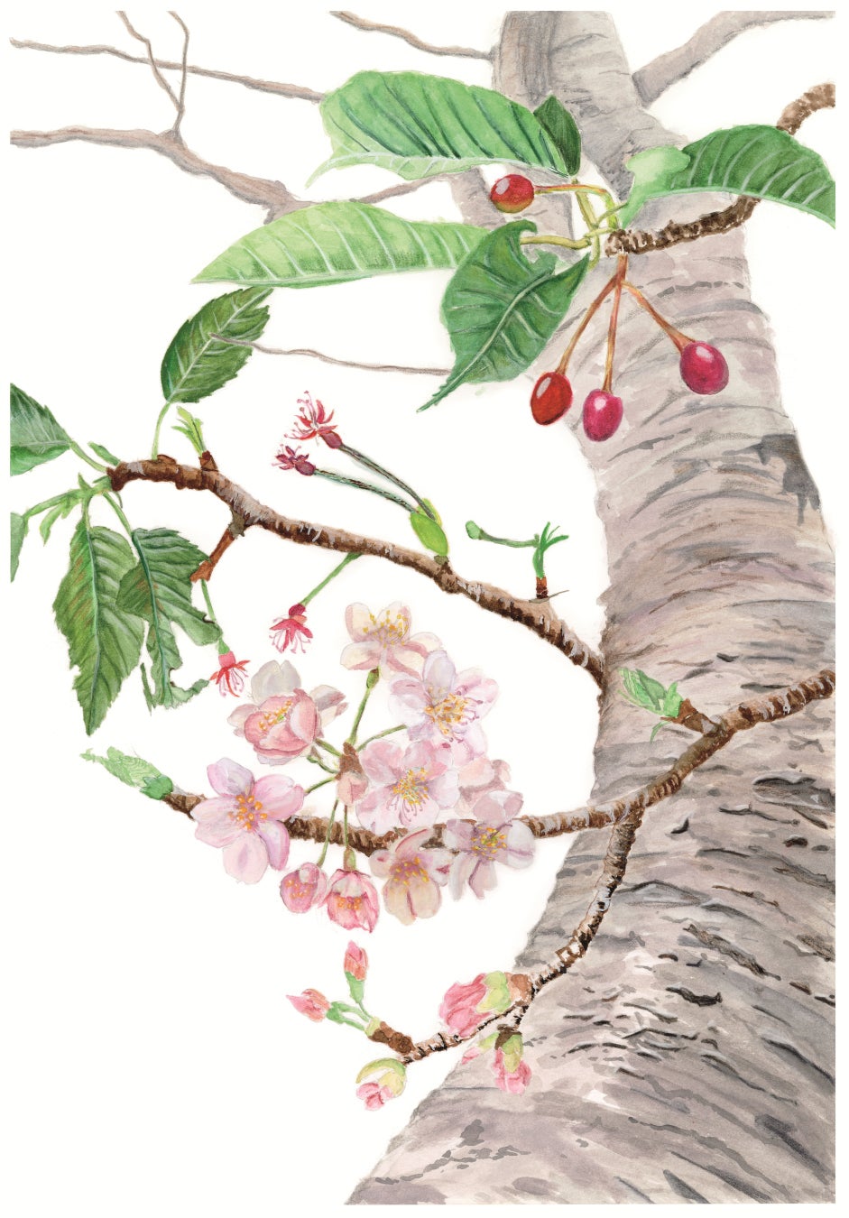 ソメイヨシノの花から実へと変化する様子をじっくり観察している作者の視点が伝わってくる作品で、異なる成長段階を組み合わせた構図がボタニカルアートとして的確に描かれている。構図がとても良く、幹の曲がり具合の表現も素晴らしい。