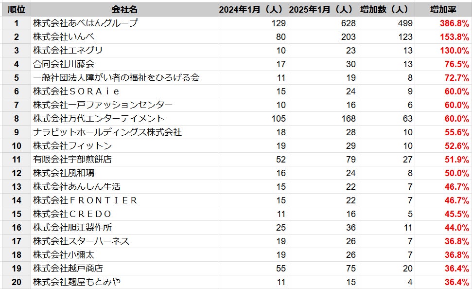 ・2024年1月時点と2025年1月時点の従業員数を比較