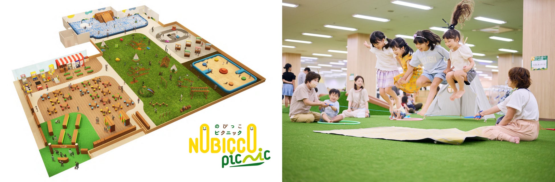 「のびっこピクニック」は、「走って、あそんで、寝ころんで のびのび屋内ピクニック!」をコンセプトに、広大な人工芝の「ピクニックエリア」でレジャーシートを広げ、まるで“公園ピクニック”のような体験ができる新感覚のプレイグラウンドです。