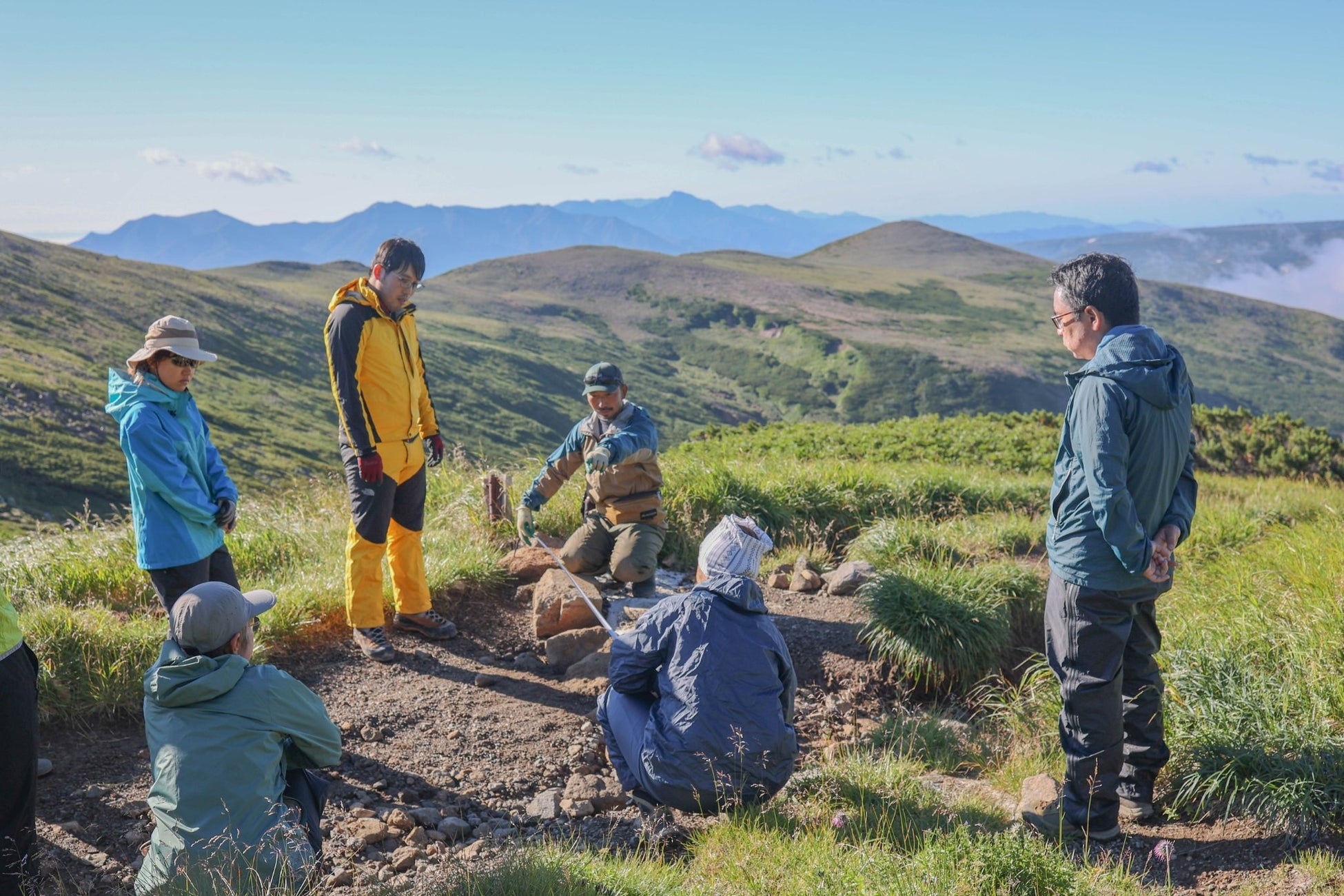 例えば、普段ツアーで歩行している大雪山の「登山道荒廃問題」は深刻な状況で、いたるところの道が崩れ歩きにくくなり、土が流され、植物が減っています。今回の取組みでは、侵食を止め、生態系を復元させる考え方の「近自然工法」を参加者が学び、登山道整備を実践することを目的としています。