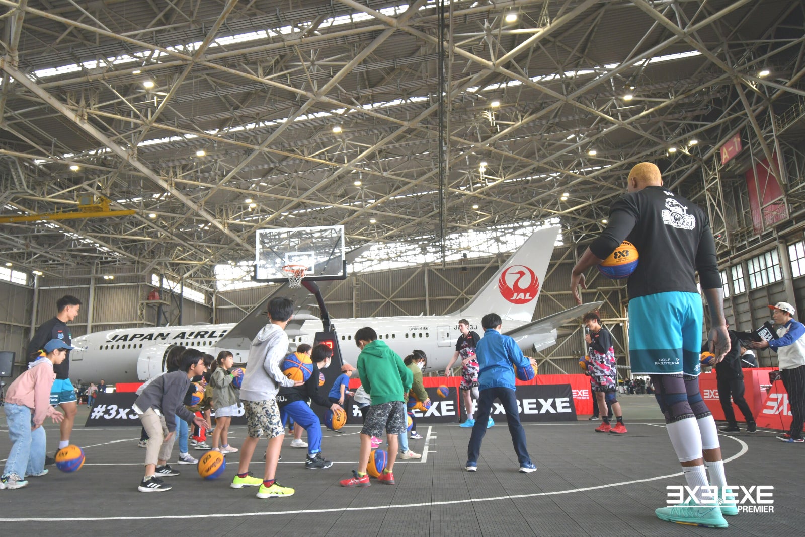 JAL旅客機を背に、3x3.EXE PREMIER特設コートを設置。小学生向け3x3クリニックや体験会も大盛況