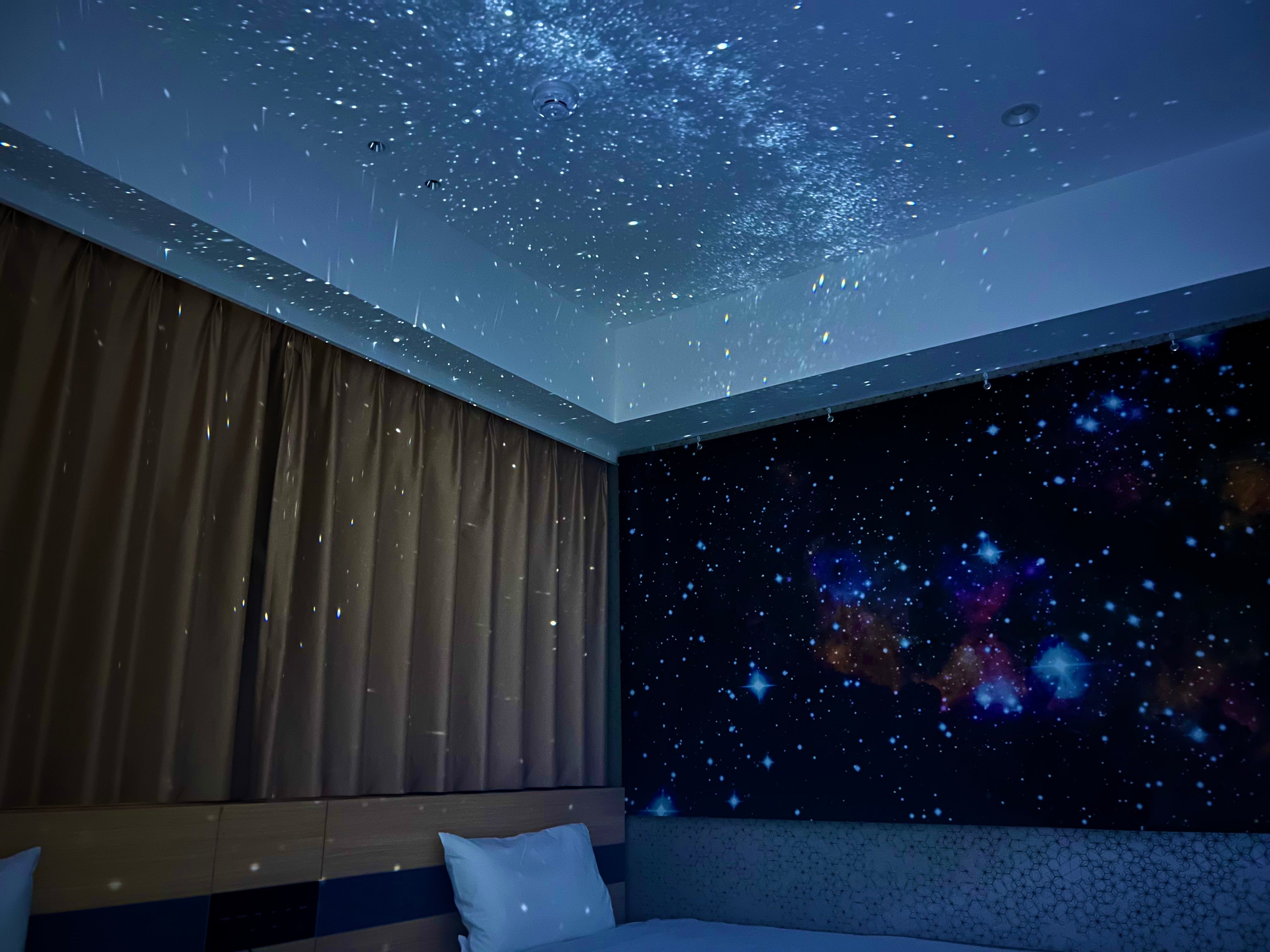 「スペースルーム」には、世界初光学式投影を採用した、セガ フェイブのー星が瞬くプラネタリウムー「Homestar」を設置し、客室内で美しい星をお楽しみいただけます。さらに、壁紙・ベッドカバーは銀河系・ロケットなどのデザインになっており、まるで宇宙空間にいるかのような時間をお過ごしいただけます。また、鹿児島市立科学館協賛の、重力の違いにより地球の約1/6となる月面体重計、TVアニメ「宇宙なんちゃら こてつくん」のぬいぐるみ、宇宙関連の書籍とマンガ「宇宙兄弟」を設置しております。さらに、お土産としてスペースカレー、宇宙日本食白米、スペースアイスなど宇宙食セットがついております。価格は、朝食付き22,600円~、素泊まり20,000円~(いずれも1室、1泊、税サ込)また、客室に設置の「Homestar」は14,500円(税込)でホテルにてお買い求めいただけます。