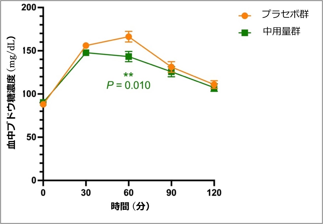 その結果、中用量群のiAUCはプラセボ群よりも有意に(約20%)低下しました(図1)。また、OGTTにおけるブドウ糖負荷60分後の血糖値は、中用量群がプラセボ群よりも顕著に低下しました(図2)。さらに、OGTTにおける高用量群のiAUC、および、ブドウ糖負荷後60分時のブドウ糖濃度もプラセボ群よりも有意に低下しました。しかし、低用量群では同様の所見は認められませんでした。中用量群、および、高用量群の空腹時血中インスリン値は、プラセボ群よりも上昇しました。なお、試験食(低用量〜高用量ミリスチン酸)に関連する臨床検査値の異常を含む有害事象は認められませんでした。また、飽和脂肪酸を過剰に摂取すると血中低比重リポ蛋白質(LDL)コレステロールを上昇させると言われていますが、試験食の摂取でLDLコレステロールの上昇は観察されませんでした。