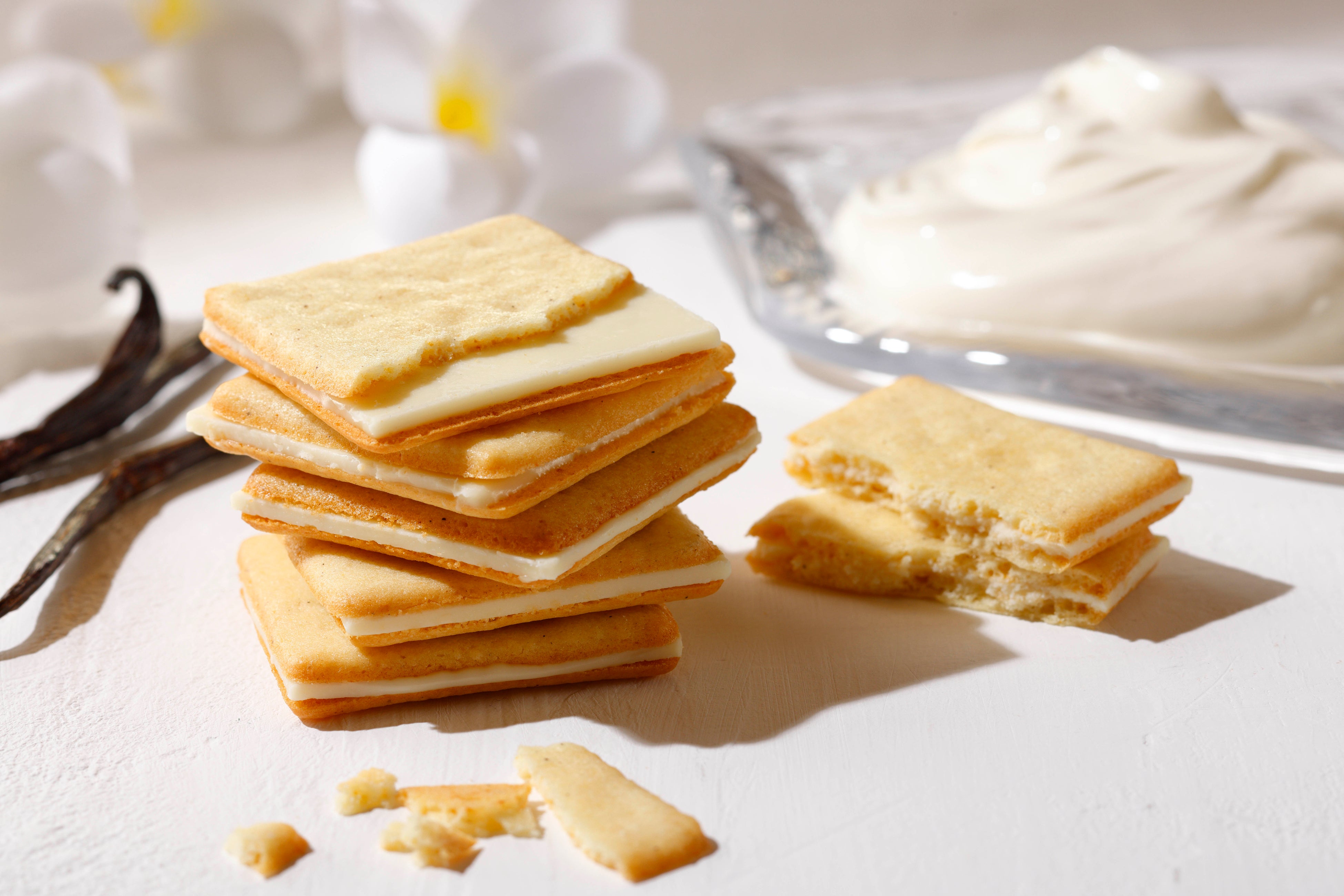 タヒチバニラをクッキー生地に混ぜ込んで焼き上げ、マスカルポーネチーズのほのかにミルク感のあるやさしい甘さのチョコレートをサンドした「バニラ&マスカールポーネクッキー」は、バニラのエキゾチックで華やかな甘い香りがふわっと広がる、サクサク食感のクッキーです。夏ならではの楽しみ方のひとつとして、冷蔵庫で冷やすとサクサククッキーにチョコレートのパリっと食感が加わる、ひとあじ違ったおいしさもお楽しみいただけます。