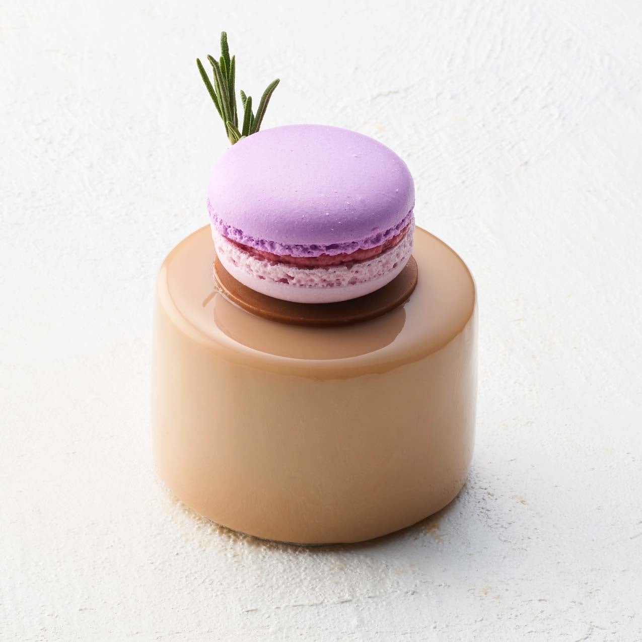 アールグレイとショコラのムースですみれとベリーのムース、ジュレを包み、マカロンで仕上げました。すみれの香りがふわりと香る春のケーキです。