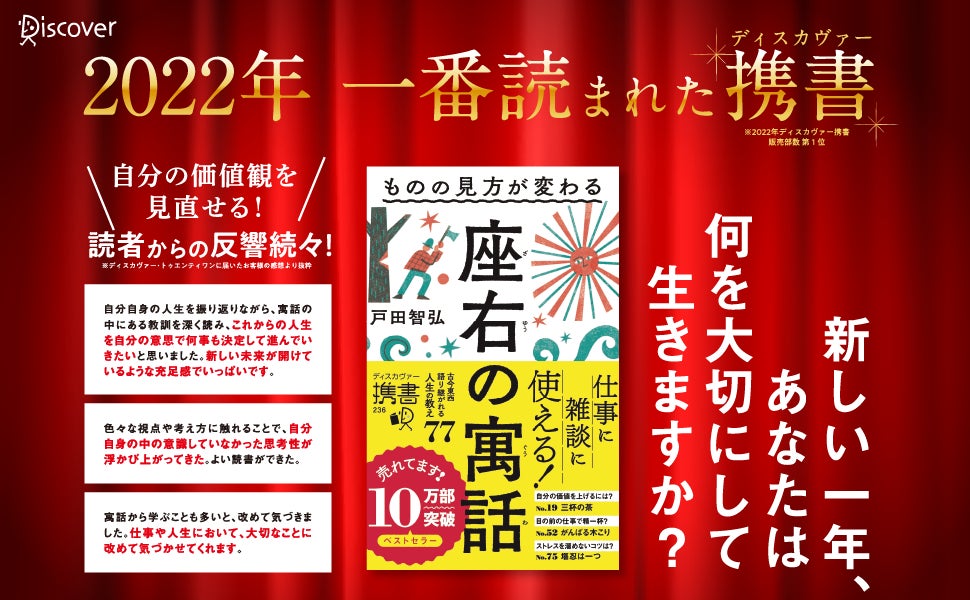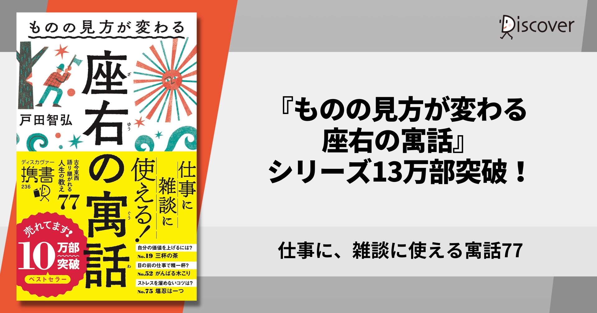 株式会社ディスカヴァー・トゥエンティワン(本社:東京都千代田区、取締役社長:谷口奈緒美)は2022年1月28日刊行の『ものの見方が変わる 座右の寓話 携書版』(戸田智弘・著)を増刷し、5万部を突破、シリーズでは13万部を突破しました。2023年5月26日には、最新刊『人生の道しるべになる 座右の寓話』の刊行も決定しています。