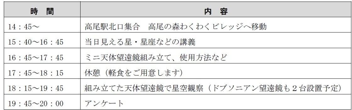 ②当日見える星空の説明や天文現象などの分かりやすい講義、ミニ天体望遠鏡作りや組み立てたミニ天体望遠鏡で星空観察、ドブソニアン望遠鏡による星空観察を実施