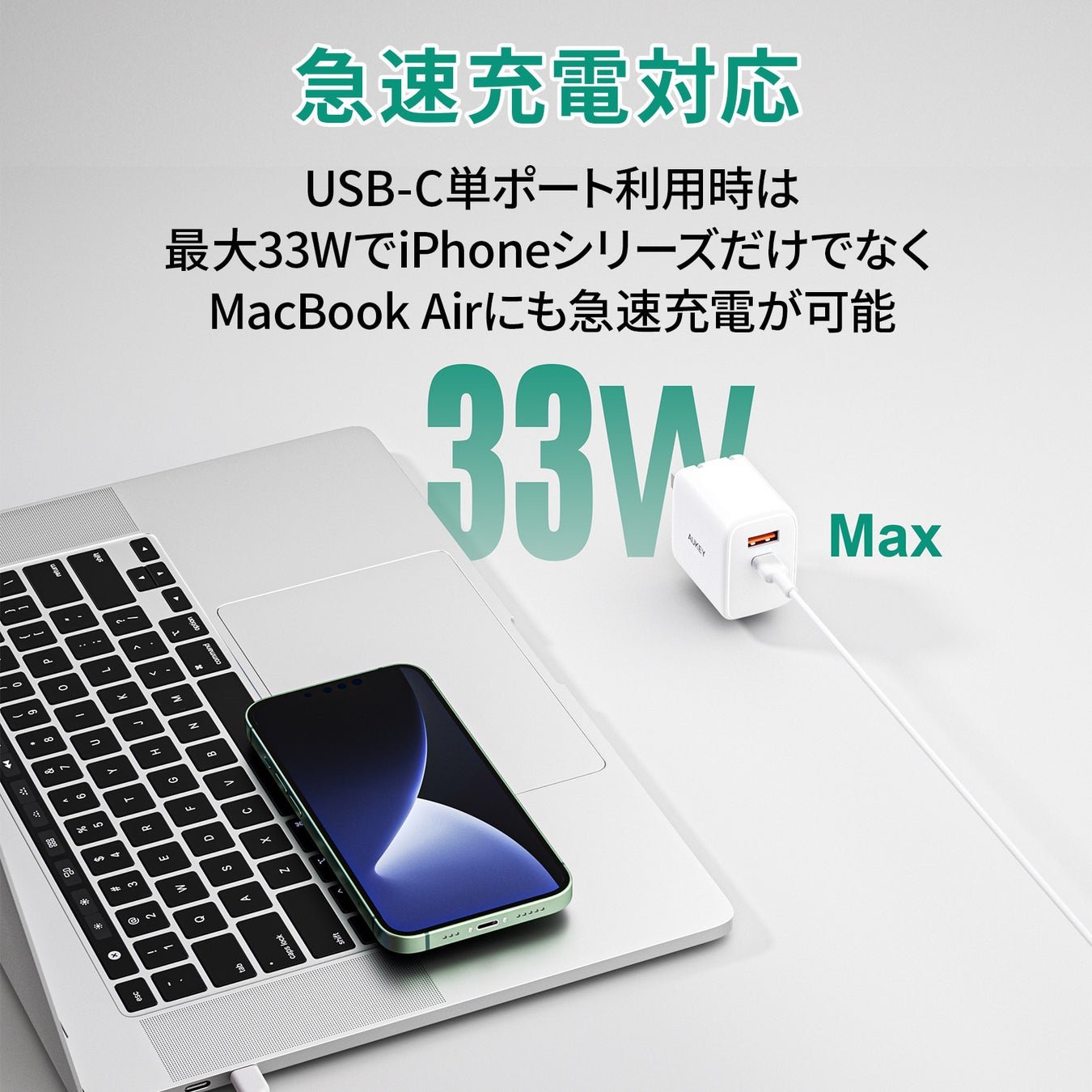 USB-C単ポート使用時は最大33Wの高出力でMacBook Airの急速充電にも対応!