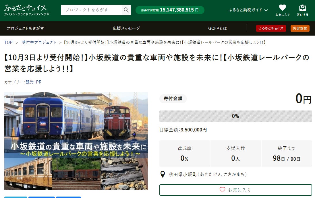秋田県小坂町とふるさとチョイス、ふるさと納税制度を活用したガバメントクラウドファンディング®で、小坂鉄道レールパークの貴重な車両や施設を保全維持するため350万円の資金調達を開始予定