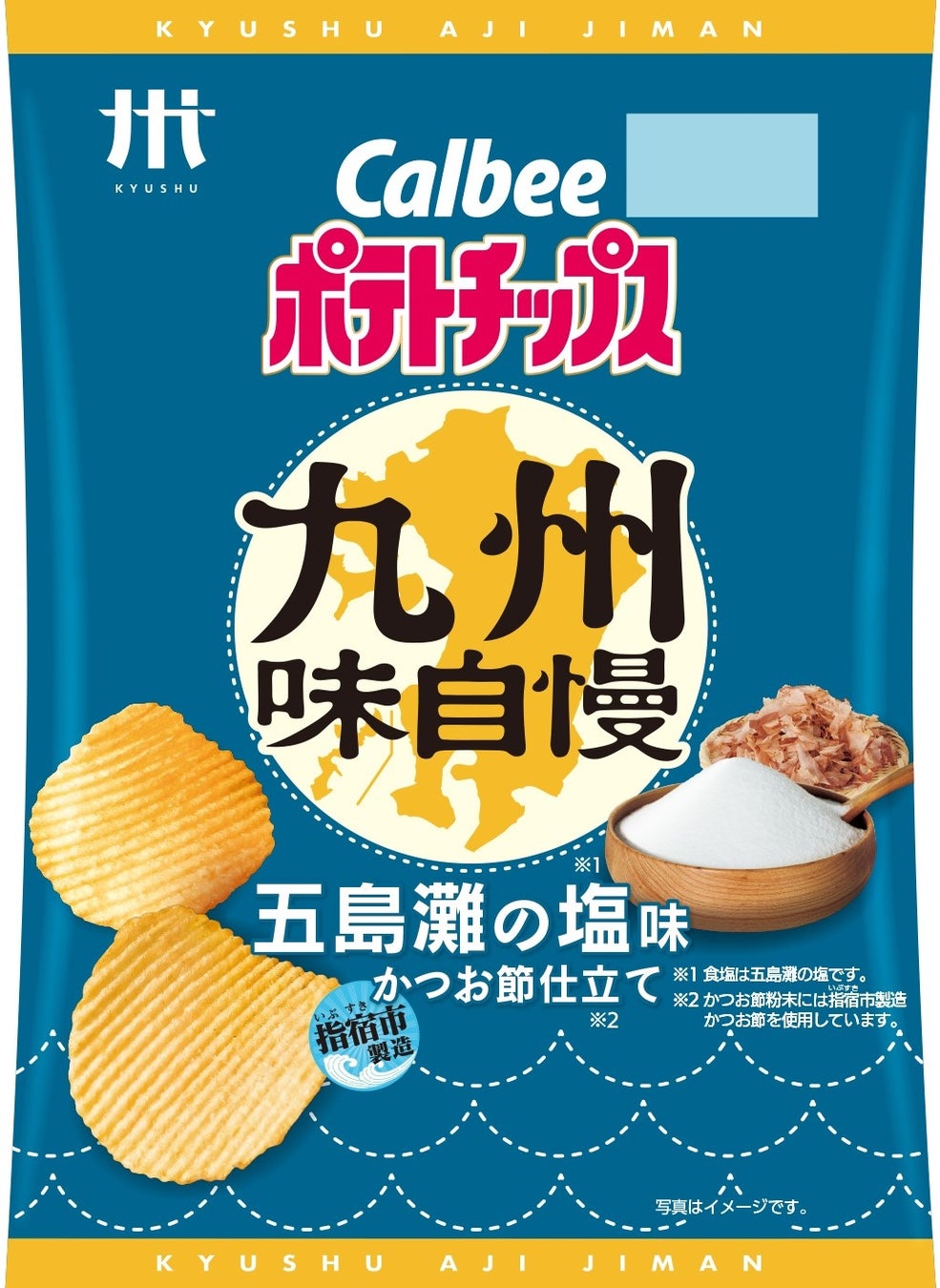 ●『ポテトチップス 九州味自慢 五島灘の塩味 かつお節仕立て』は、まろやかな味わいが特徴の五島灘の塩に指宿市製造のかつお節を加え、旨みのある塩味に仕上げました。