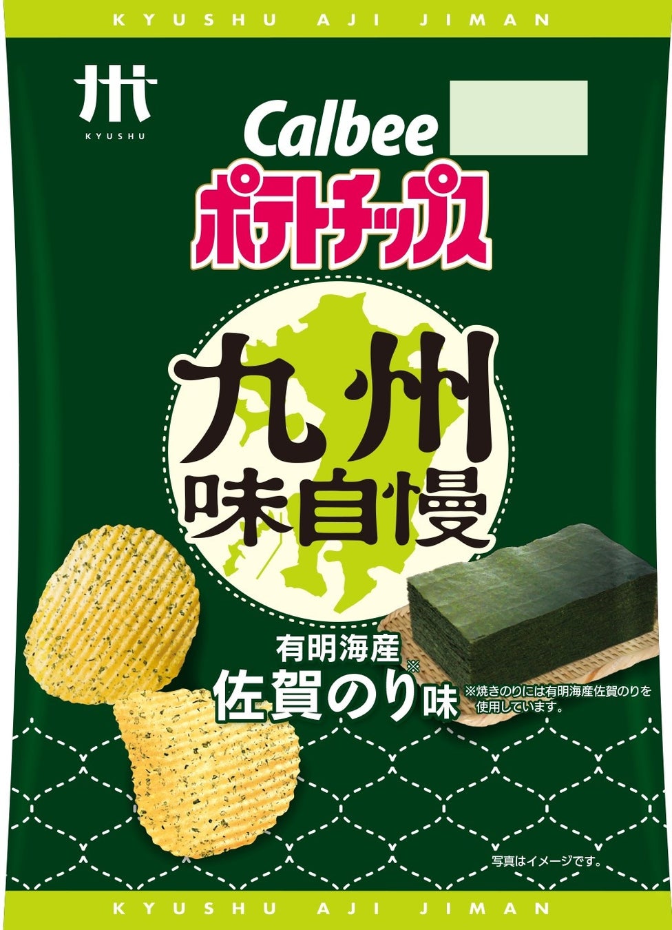 ●『ポテトチップス 九州味自慢 有明海産佐賀のり味』は、焼きのりに有明海産佐賀のりを使用。甘めの味付けで、しっかりとのりの風味が続くように仕上げました。