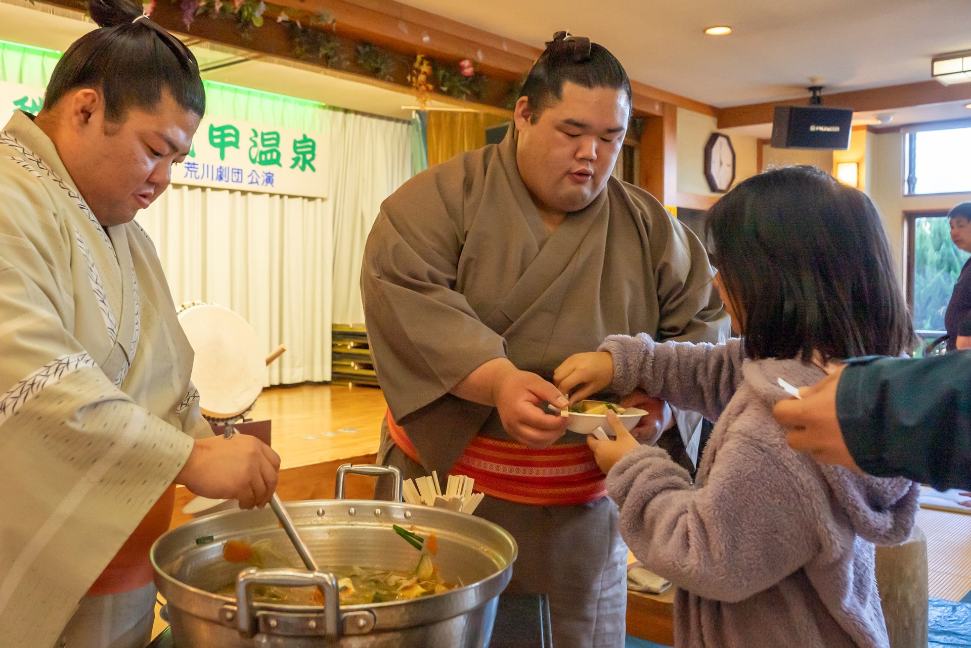 6月7日、秩父湯元 武甲温泉に「雷部屋」がやってくる! 力士がふるまう「ちゃんこ」を食べて記念撮影。期間限定の特盛メニューも販売