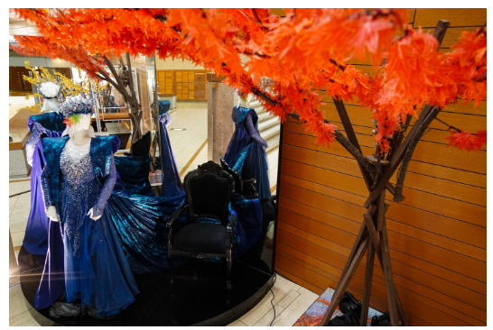 「初台アート・ロフト」の会場である新国立劇場のオープンスペースは、高い天井と自然光に満ちた開放的な空間。劇場という日常と非日常が交差する場所で、舞台衣裳の存在感と美しさを、ゆったりとご堪能いただけます。