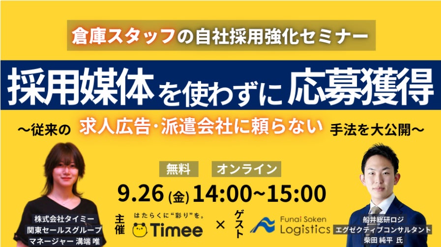「採用媒体を使わずに応募を集める!?倉庫スタッフの自社採用セミナー (主催:株式会社タイミー)」にて船井総研ロジの物流コンサルタントが講演します|9月26日(金)