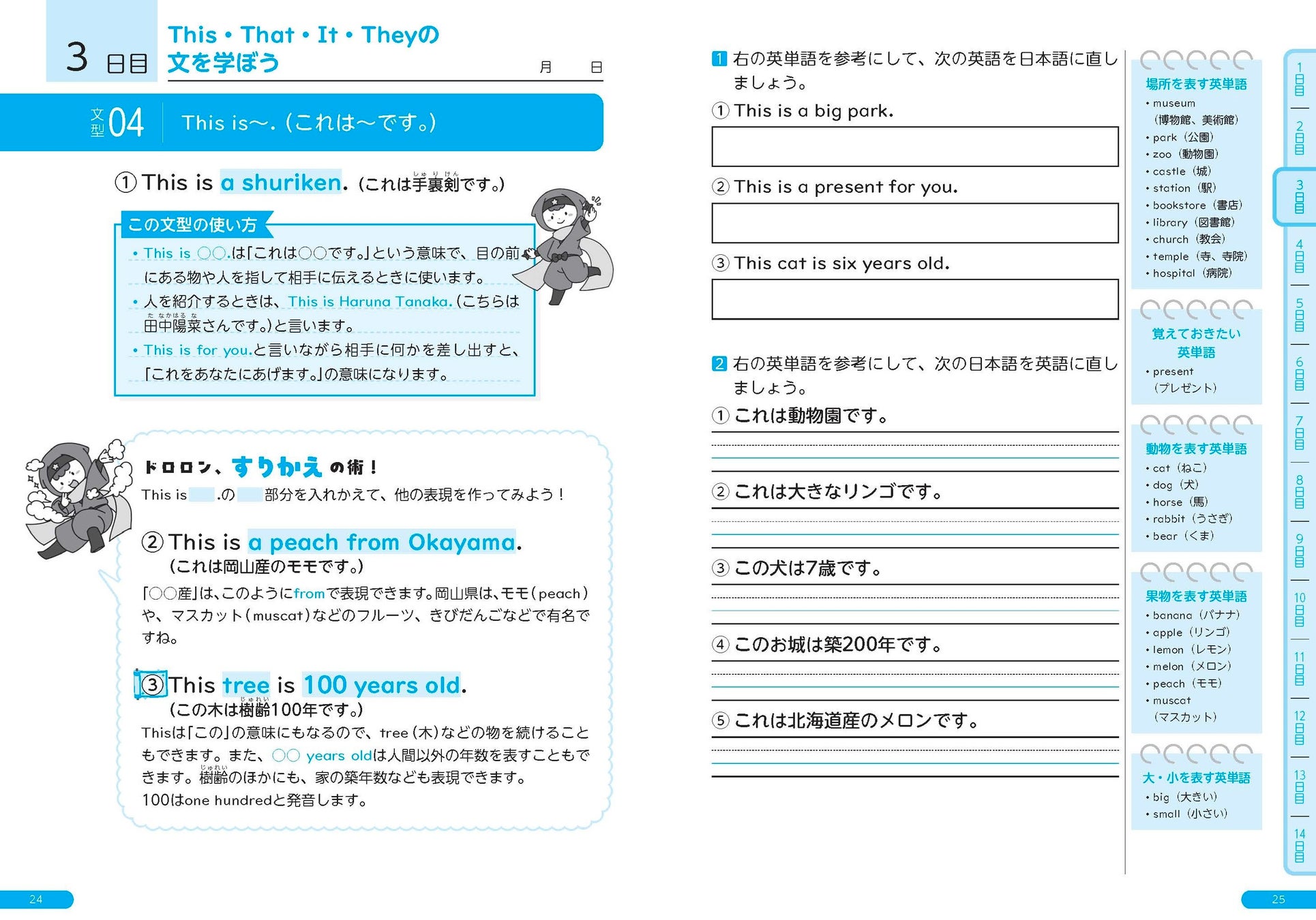 見習い忍者のコトノハ丸、その幼なじみのムササビ・ハナブサと一緒に学習を進めます。本書では「すりかえの術」=パターンプラクティスの学習法で復習を進めるため、ぐんぐん英作文が得意になります。問題に使用する英単語はすべて紹介しているので、辞書不要ですぐに取り組めます。