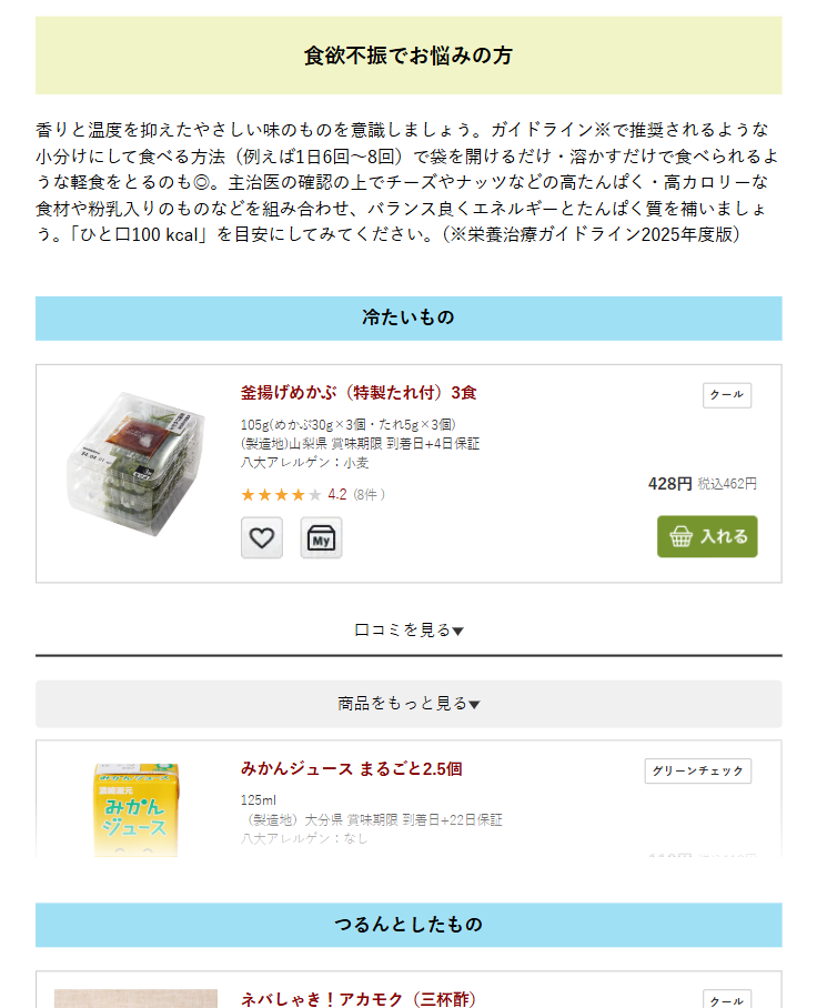 特集コンテンツでは、がんの最新のガイドラインを参考にして副作用を12種類に分類し、副作用への対応方法とそれに即した70種類以上の食品を管理栄養士が選び提案しています。お客さまは、自分の副作用症状からそれに合う食品を探すことができるほか、副作用に対する自己理解の程度に合わせても選ぶことができ、どんな治療期の方でも迷わず自分の副作用に対応した食品を探し出すことができます。提案する食品は、実際に食べた方の感想も取り入れながら随時更新。ヘルスケアOisixを利用する方や、医療機関と連携した試食会に参加したがん患者さんなどの声を取り入れながら提案の質を持続的に向上させていきます。