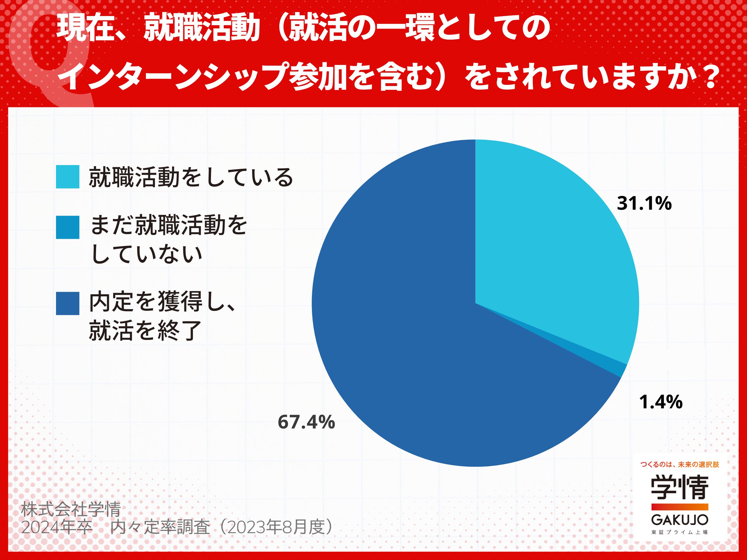 “就職活動をしている”学生は「31.1%」と前月から11.8ポイント減り、“内々定を獲得し、就活を終了”した学生は「67.4%」に。3人に2人は就職活動を終了していることが分かります。