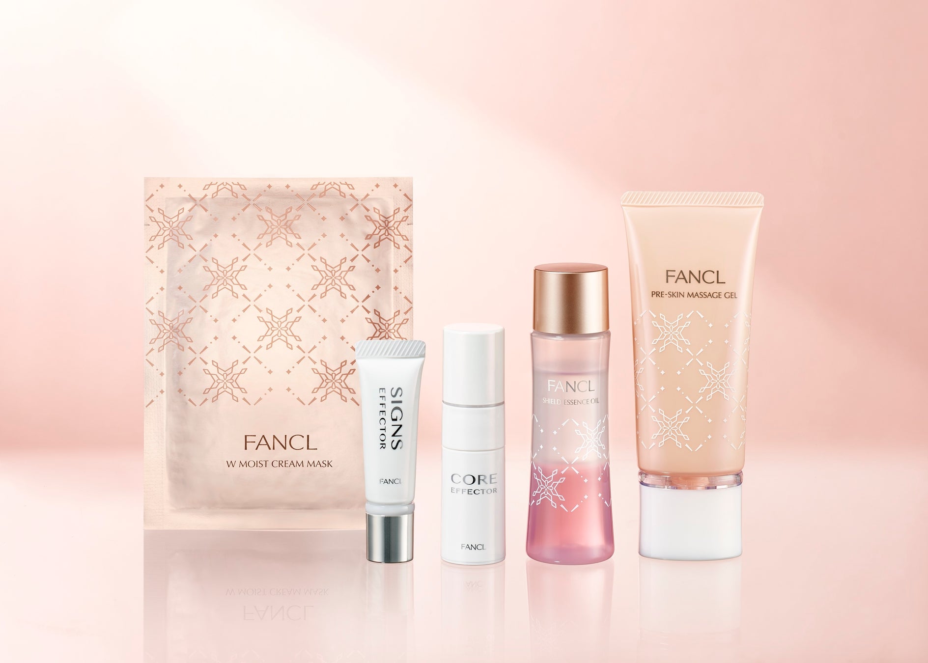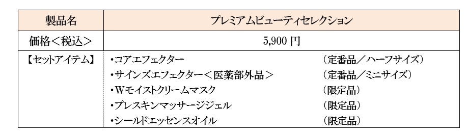 セットアイテムは、肌のコア※3にアプローチして肌の力をサポートする美容液「コアエフェクター」と、コラーゲン産生を促してシワを改善するナイアシンアミド配合のシワ改善美容液「サインズエフェクター<医薬部外品>」という当社人気エイジングケア※2の2アイテムに、なめらかな肌に整える温感マッサージジェル「プレスキンマッサージジェル」、与えたうるおいを閉じ込めて逃がさない「シールドエッセンスオイル」、うるおいやハリ・弾力を集中的に与える「Wモイストクリームマスク」をラインアップしました。
